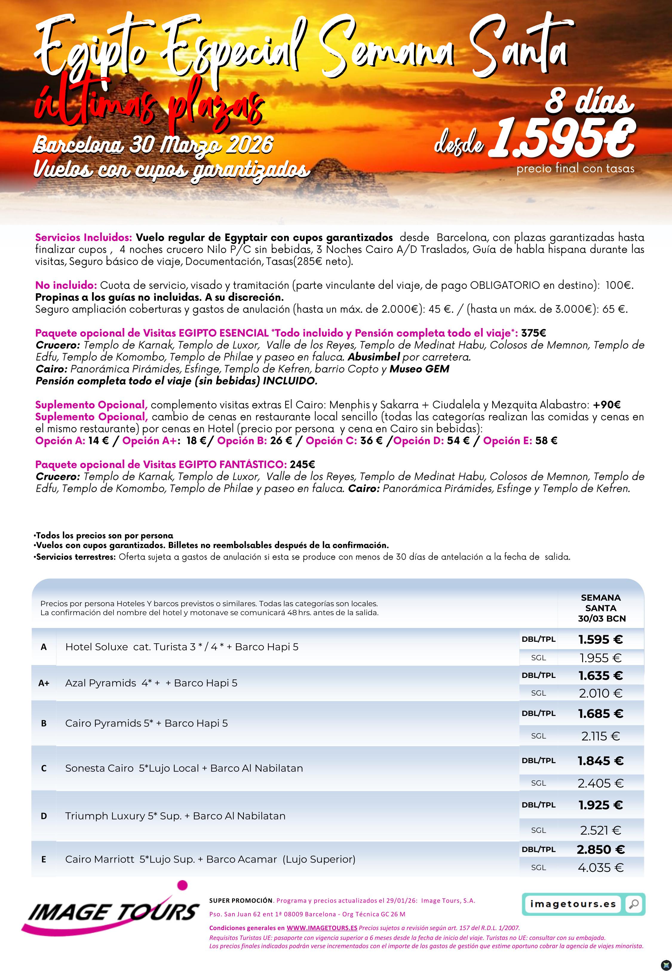 Egipto Semana Santa 2026, Últimas plazas 30 de marzo, con cupos y precios desde 1.595€
